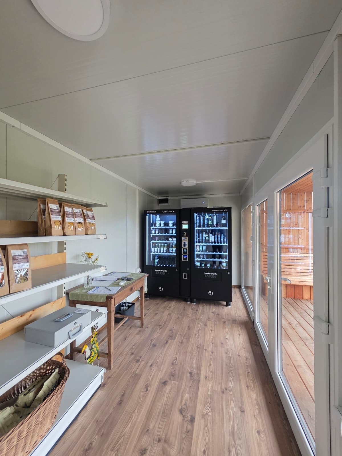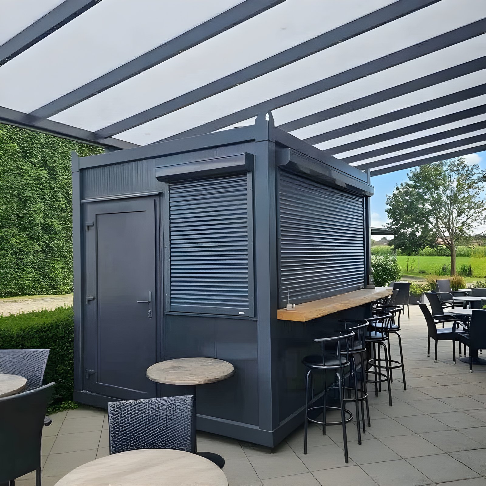 The container is designed to create an efficient workflow for staff while offering a clear and inviting sales area toward customers. The kiosk container can be customized with serving hatches, counter surfaces, windows, and doors according to the needs of the business, and can easily be configured for food, beverage, or retail sales.
